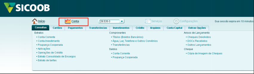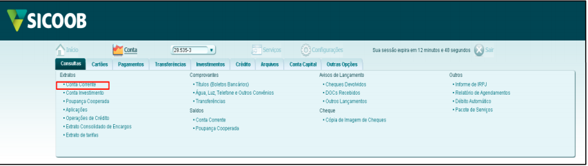 Logo em seguida clique, na opção: Consultas > Conta Corrente.