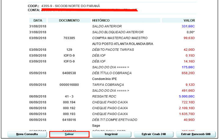 Na sua tela, aparecerá o extrato gerado e ao clicar em Salvar, algumas opções de formatos do arquivo OFX estarão disponíveis.