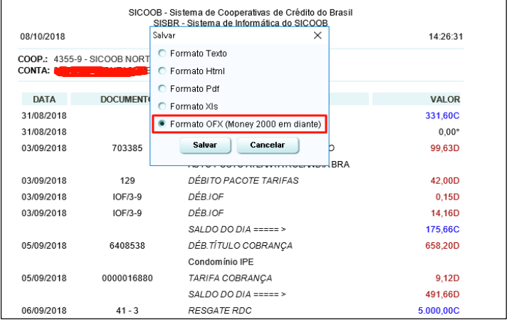 Com as opções disponíveis, por favor, selecione a opção: Formato OFX (Money 2000 em diante) e clique em: Salvar.